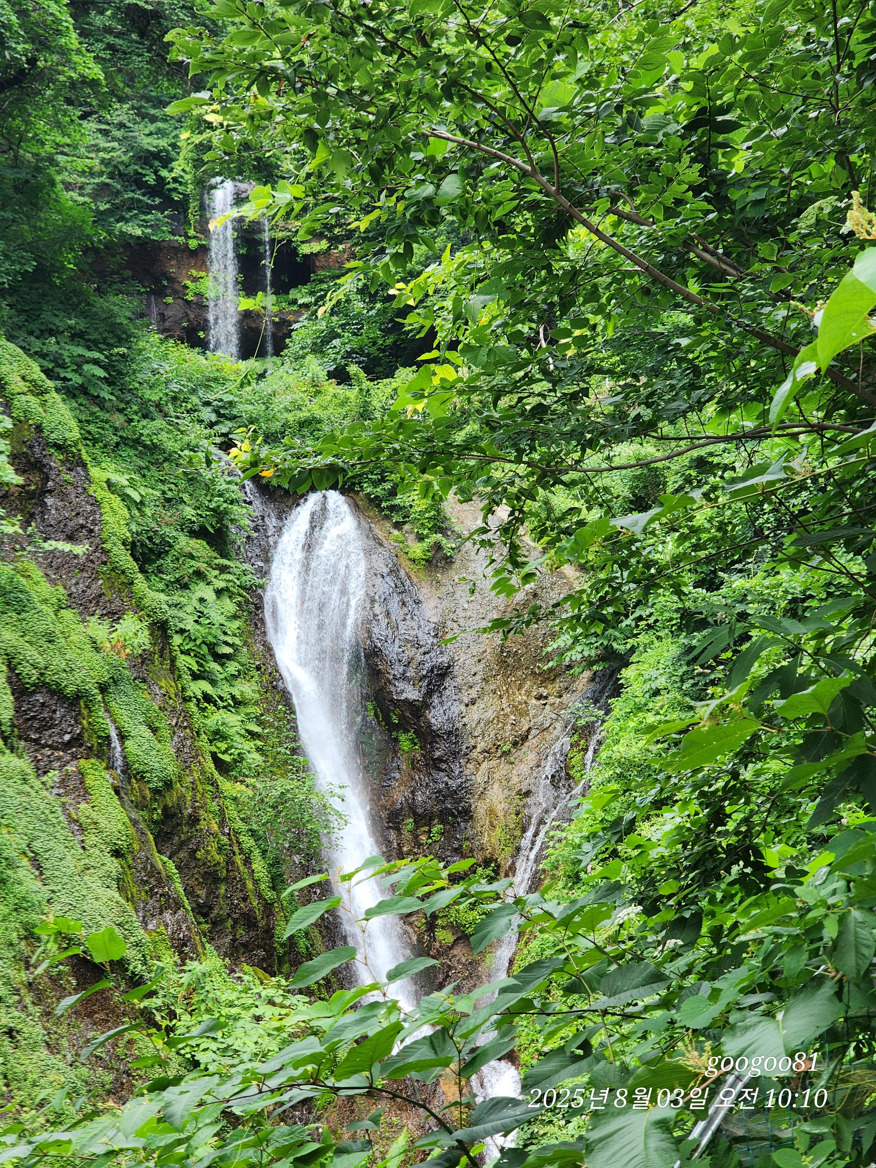시원하게 쏟아지는 봉래폭포의 모습이에요. 초록빛 숲 속에 우뚝 솟아있는 폭포의 물줄기가 정말 웅장했습니다. 눈과 귀가 모두 시원해지는 기분이었어요. 💦