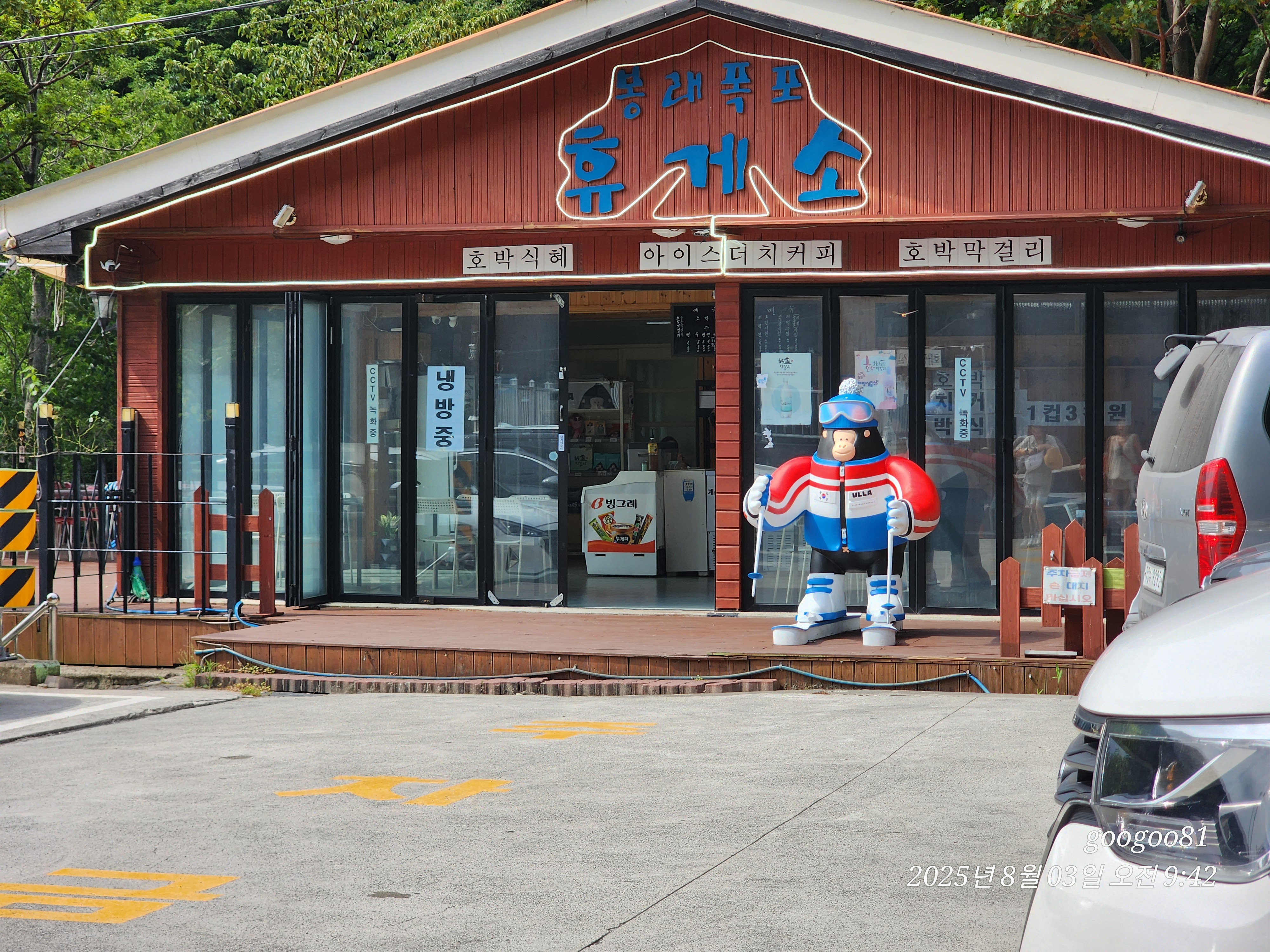 봉래폭포로 향하는 길은 초록빛 나무들로 가득했어요. 길가에는 '호박막걸리'나 '호박식혜' 등을 파는 휴게소들이 많아서 잠시 쉬어가기 좋았습니다.