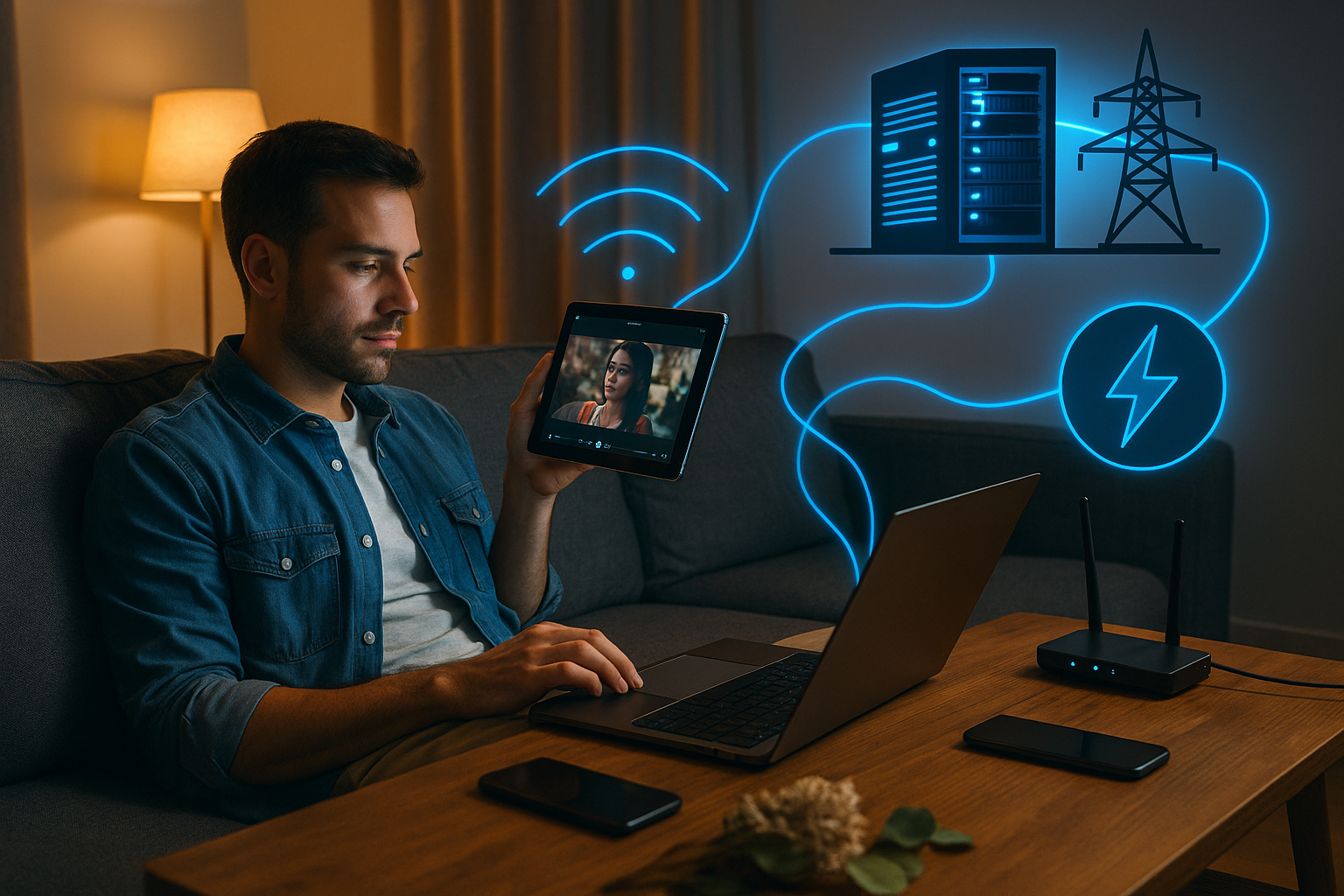 디지털 서비스는 보통 기기(Device) → 네트워크(Network) → 데이터센터(Data Center) 3단계를 거칩니다. 화면 밝기·해상도·연산량이 전력 사용을 키우고, 데이터가 오갈수록 라우터·기지국이 에너지를 쓰며, 데이터센터는 서버 가동과 냉각(Cooling)에 큰 전력이 필요합니다.
