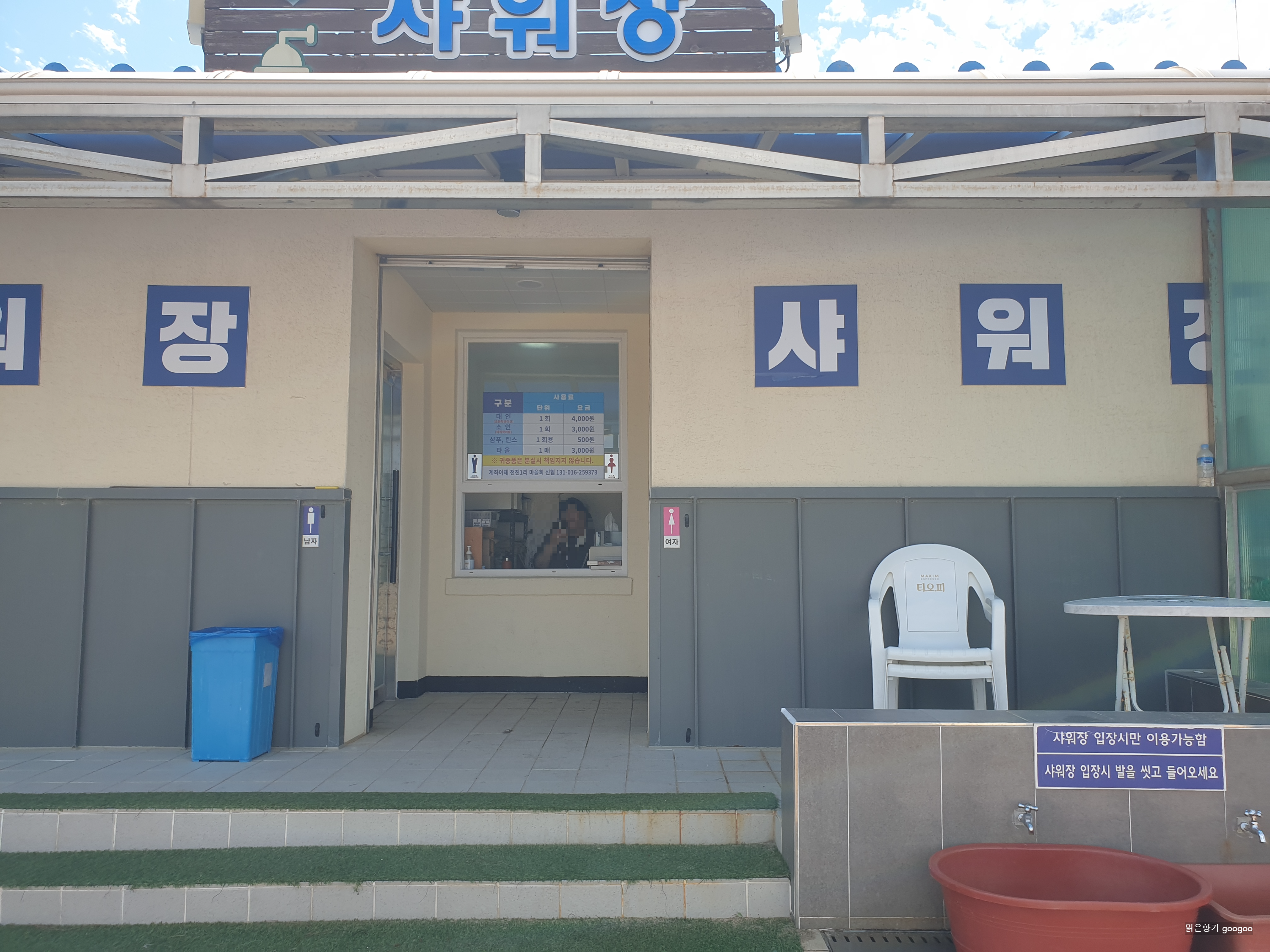 입구에는 샤워장 이용 요금 안내판이 있었고 요금을 내고 들어갔답니다. 비누는 준비가 되어 있었고, 나머지 물품들은 본인이 준비해 가야 해요. 샤워장 내부로 들어가는 문도 따로 있었어요. 물놀이 후 모래를 털어내고 깨끗하게 씻을 수 있어 편리했습니다.