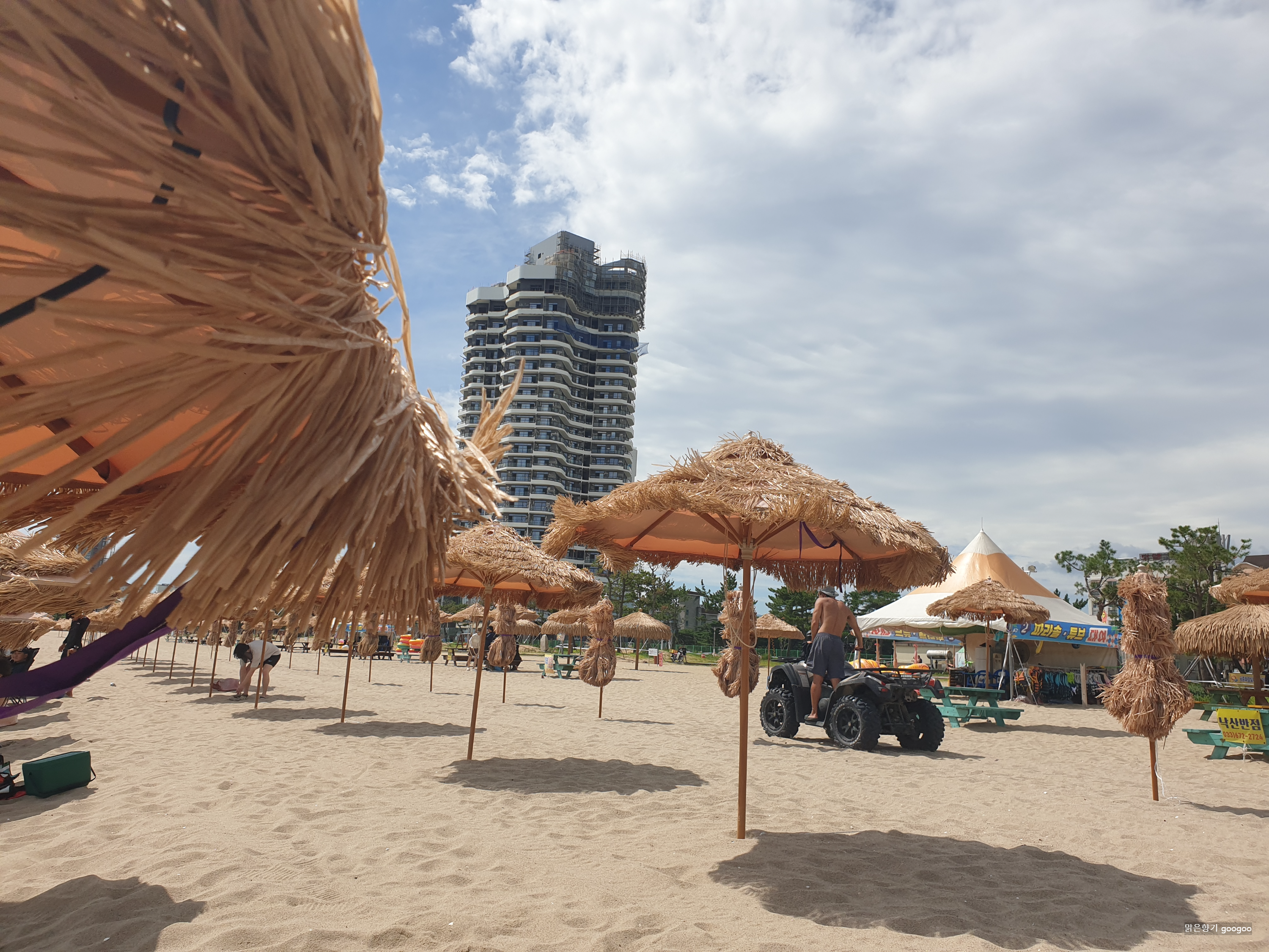 해변을 따라 길게 이어진 백사장과 푸른 바다, 그리고 그 위를 수놓은 파라솔들까지. 양양의 아름다운 풍경을 한눈에 담을 수 있는 멋진 곳이었어요. 안전요원들도 곳곳에 배치되어 있어 안전함을 느끼며 해수욕을 즐길 수 있었습니다.