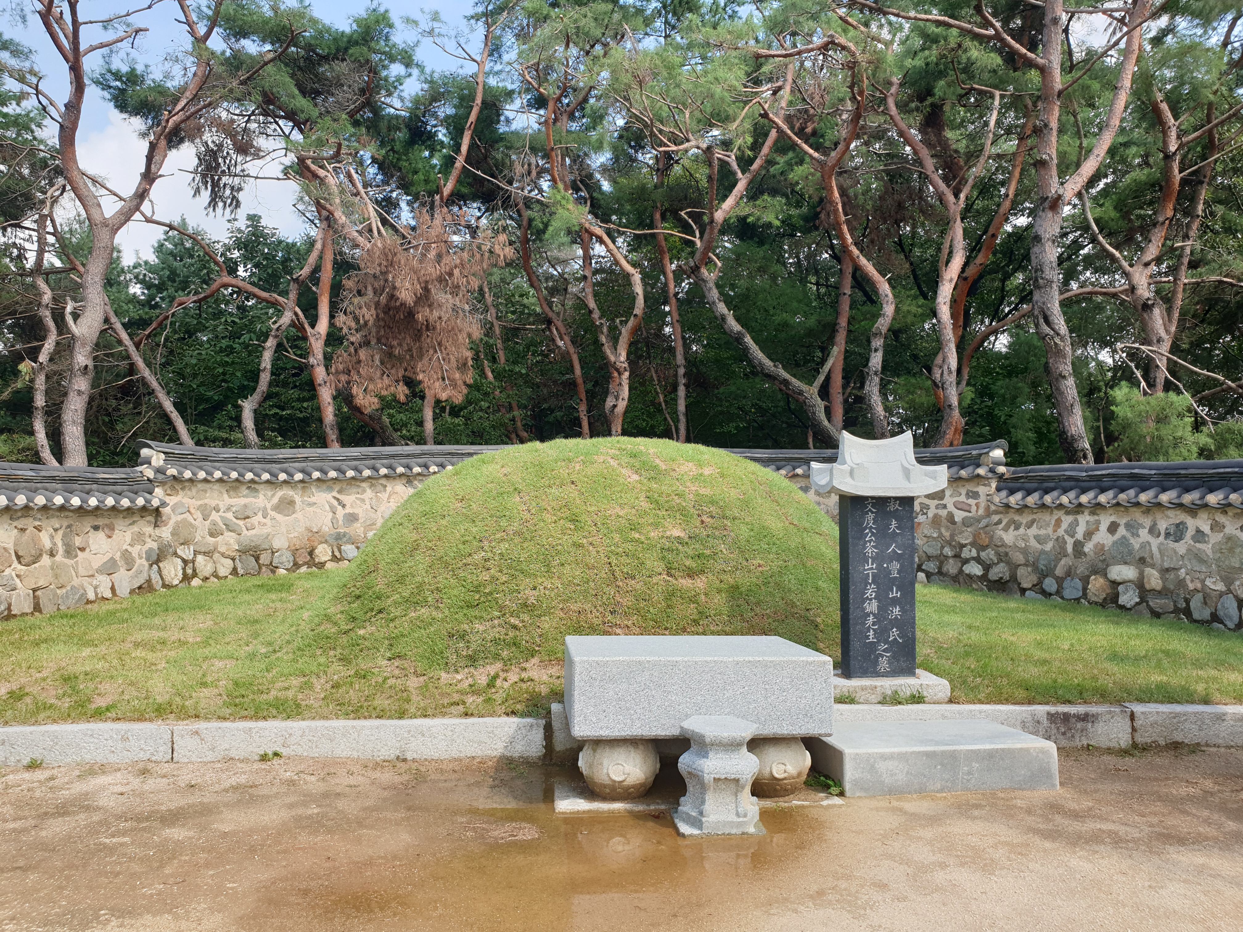 드디어 다산 정약용 선생과 부인 홍씨의 합장묘에 도착했습니다. 아담하지만 단정하게 관리된 묘역에서 다산의 마지막 안식처를 느낄 수 있었어요. 푸른 잔디와 주변의 소나무들이 평화로운 분위기를 자아내고 있네요.