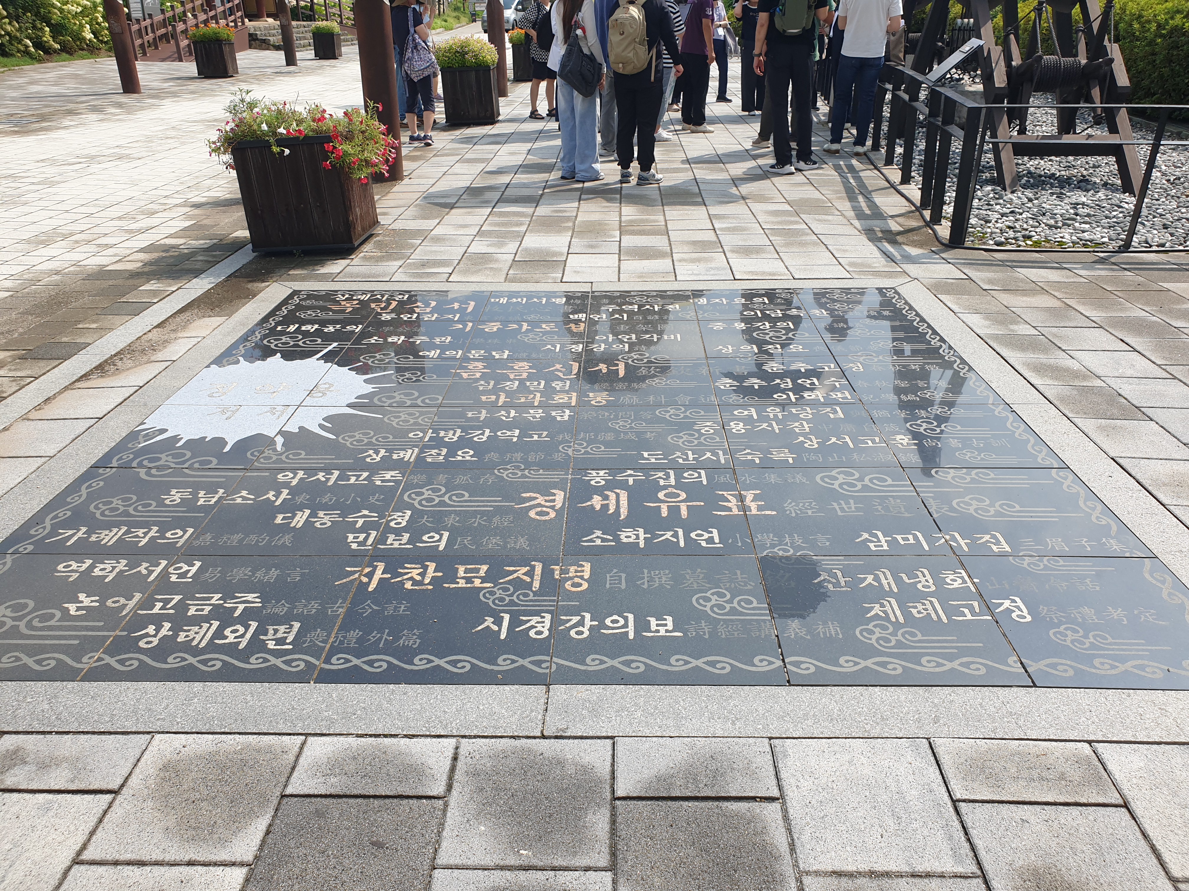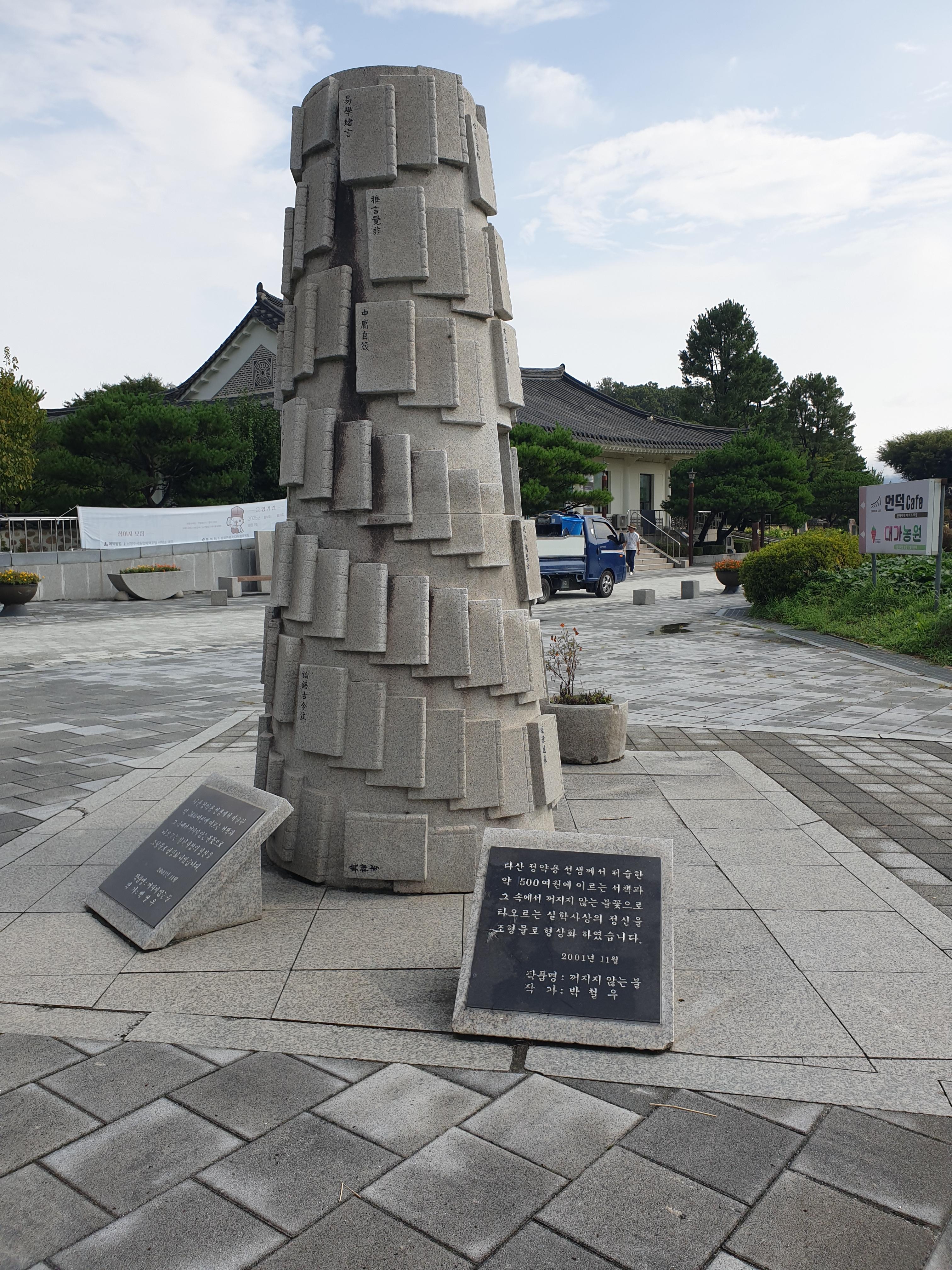다산의 업적을 기리는 조형물들도 곳곳에 세워져 있었어요. 다산이 집필했던 책들을 형상화한 듯한 조형물이 인상 깊었답니다. 그 앞에 놓인 글귀들을 읽으며 다산의 삶을 되새겨볼 수 있었어요.