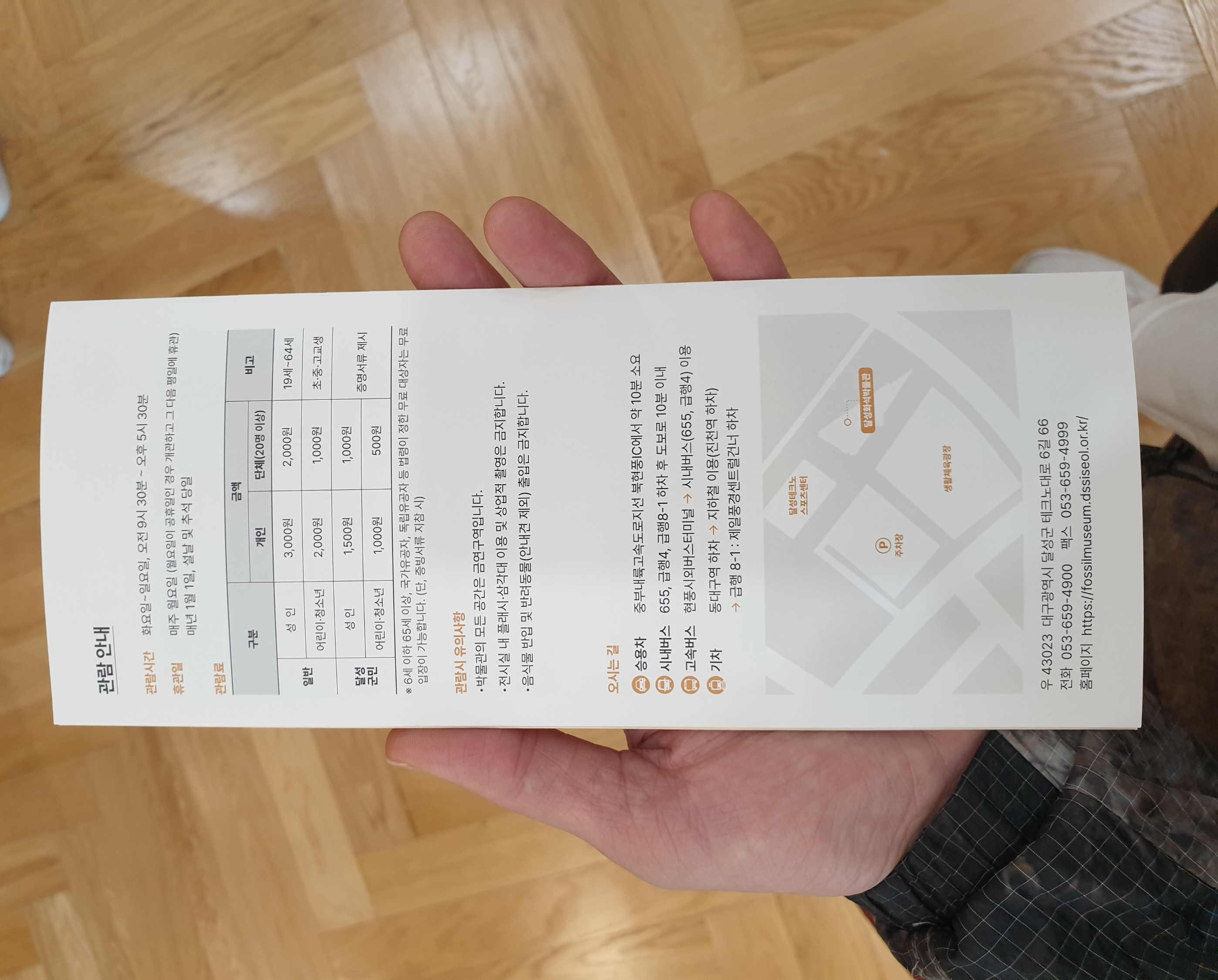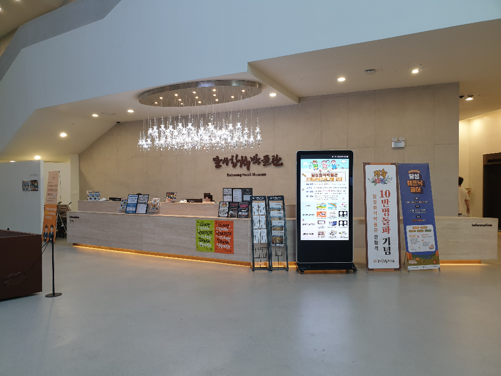 드디어 달성 화석 박물관에 도착했습니다! 이곳은 지구의 오랜 역사를 눈으로 보고 손으로 느끼며 배울 수 있는 특별한 공간이에요. 카운터에는 친절한 직원분들이 방문객을 맞이하고 있었고, 다양한 전시 안내도 준비되어 있었습니다.