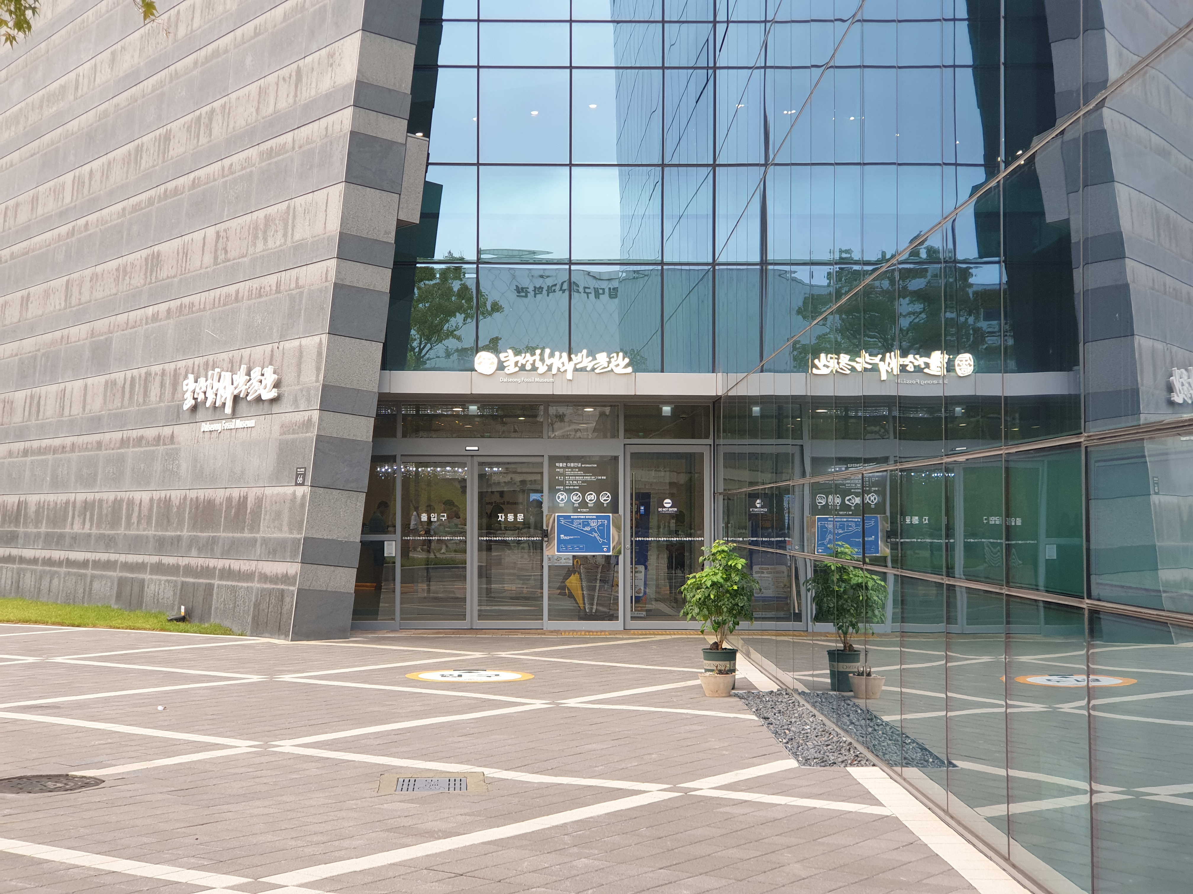 달성화석박물관 입구는 깔끔하고 웅장한 모습이 인상 깊었어요. 유리로 된 외벽에 하늘과 주변 풍경이 비쳐 아름다운 풍경을 만들어냈습니다.
