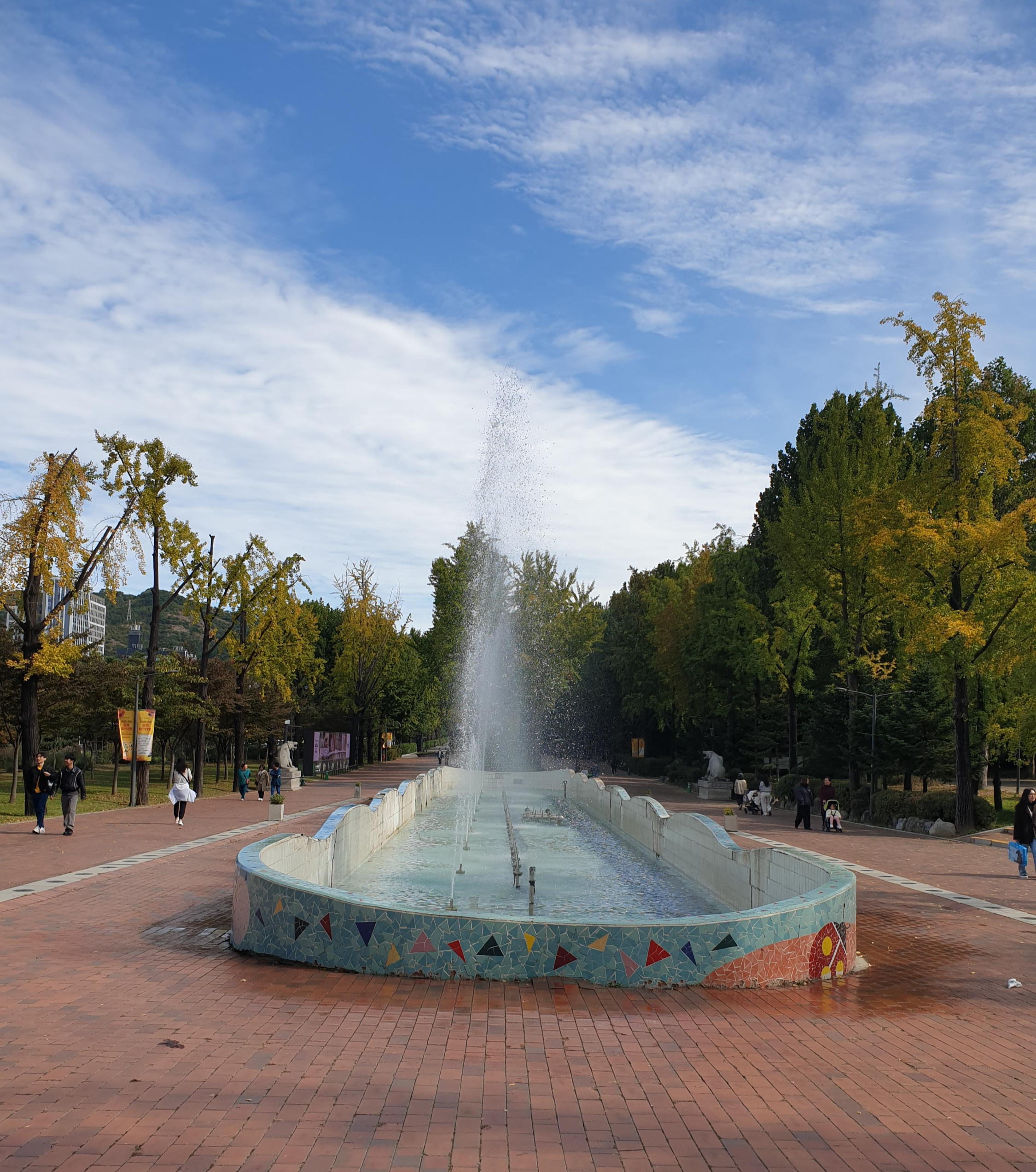 분수 주변의 울긋불긋한 나무들과 파란 하늘이 완벽한 조화를 이루었죠. 잠시 벤치에 앉아 물소리를 들으며 여유를 만끽했답니다.