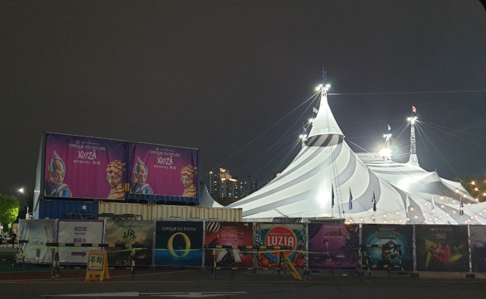 어두운 잠실 밤하늘 아래, 우뚝 솟아있는 태양의 서커스(Cirque du Soleil)의 빅탑!