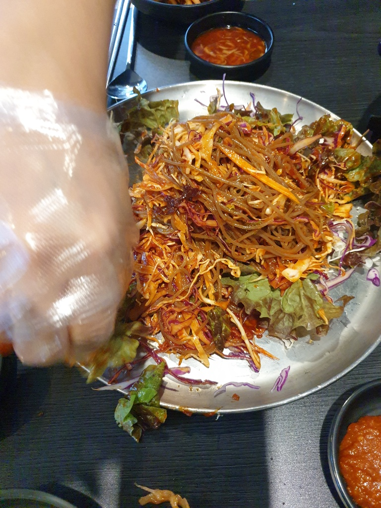 장갑을 끼고 쟁반막국수를 열심히 비벼봅니다. 매콤달콤한 양념과 아삭한 채소, 쫄깃한 면발이 족발의 느끼함을 싹 잡아주는 최고의 궁합이었어요. 🍜