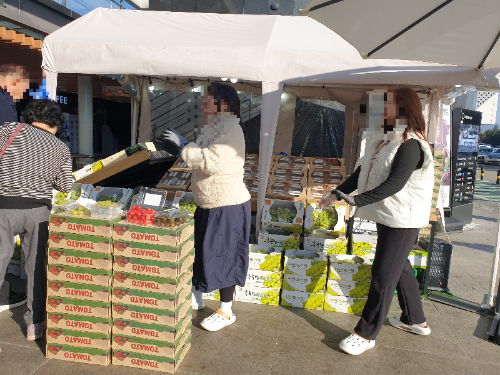 포도(샤인머스켓)와 토마토 박스가 가득 쌓여있었는데, 여행길에 건강한 간식을 챙기려는 사람들이 많이 찾는 것 같았습니다. 🍇