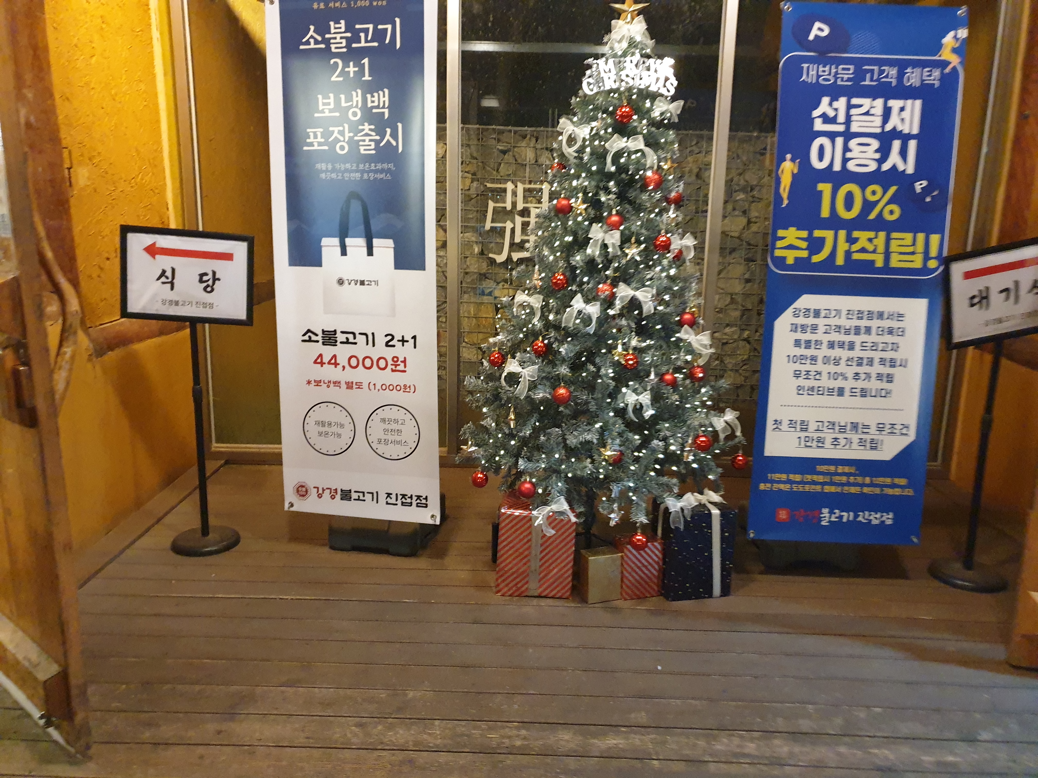 입구에는 반짝이는 크리스마스트리가 방문객들을 맞이하고 있어 연말의 들뜬 기분까지 느낄 수 있었습니다. 소불고기 포장 이벤트 안내판을 보니, 맛있는 음식을 집에 있는 가족들과도 나누고 싶은 마음이 들더군요.